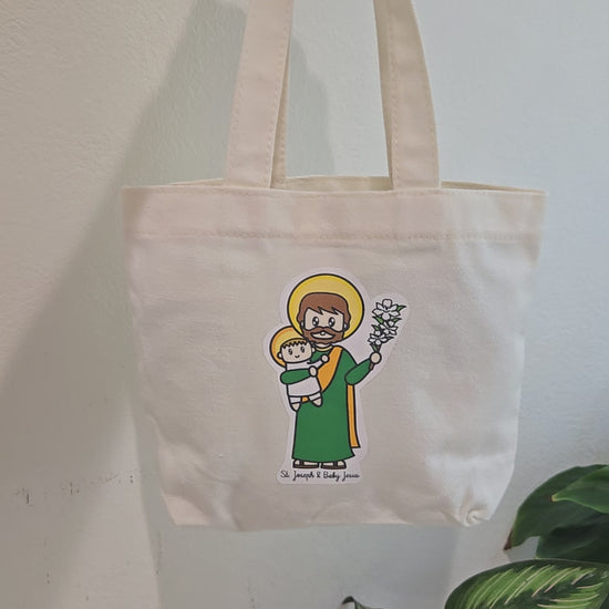 Carry your faith with a touch of sweetness with our St. Joseph & Baby Jesus Cute Mini Tote Bag!
